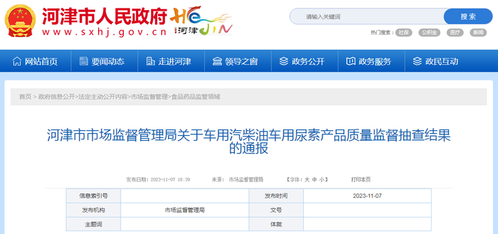 山西省河津市市场监管局关于车用汽柴油车用尿素产品质量监督抽查结果的通报