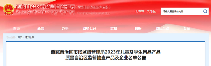 西藏自治区市场监管局公布2023年儿童及学生用品产品质量监督抽查产品及企业名单