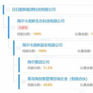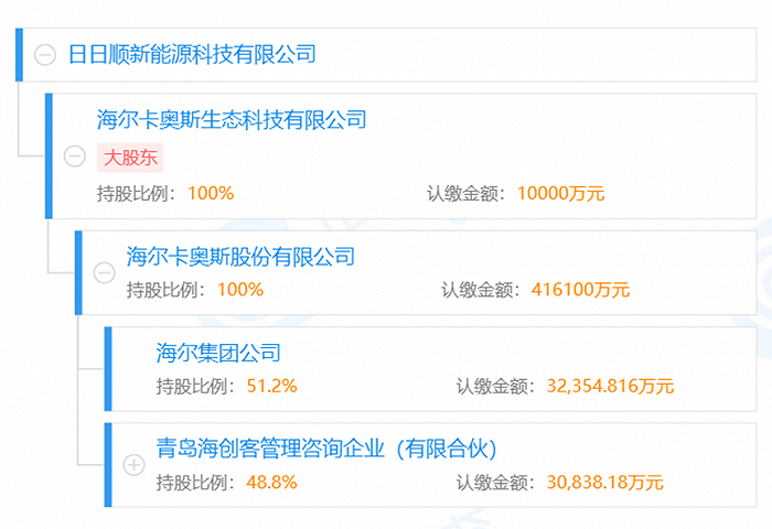 而关于“日日顺”这个名字,最新相关的是2022年5月成立的日日顺新能源科技,该公司注册资本1亿,由海尔卡奥斯生态科技有限公司全资持股,后者由海尔集团公司、青岛海创客管理咨询企业(有限合伙)持股。