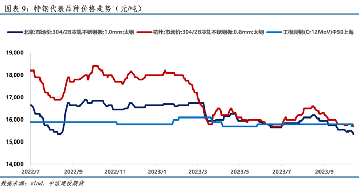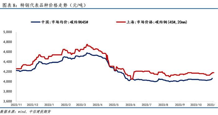 本周特钢价格涨跌不一。工模具钢较上周环比持平,碳结钢市场较上周上涨27元/吨,上海碳结钢较上周上涨30元/吨,冷轧不锈钢板1.0mm环比下跌150元/吨、0.8mm较上周环比下跌100元/吨。工模具钢(Cr12MoV)Φ50上海价15700元/吨,碳结钢:45#:Φ20mm上海价4180元/吨,碳结钢45#市场均价4065元/吨,304/2B冷轧不锈钢板:1.0mm北京市场价为15350元/吨,0.8mm杭州市场价为15700元/吨。