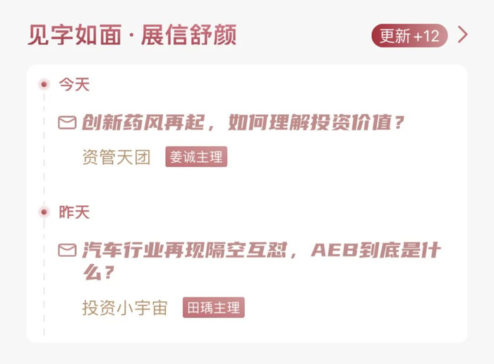 基金净值是一条曲线,但我们还希望投资路上的好朋友们能理解曲线背后的投资理念、框架和思考。为此,我们梳理并聚合了与您的持仓高度相关的基金经理投研思考、图解版的产品月报和季报等内容。点击「贴心服务-探索更多」,就能在 见字如面·展信舒颜 模块看到更新的内容。之后,我们会开发定制的消息推送功能,帮助您第一时间了解持仓变动和基金经理动态。