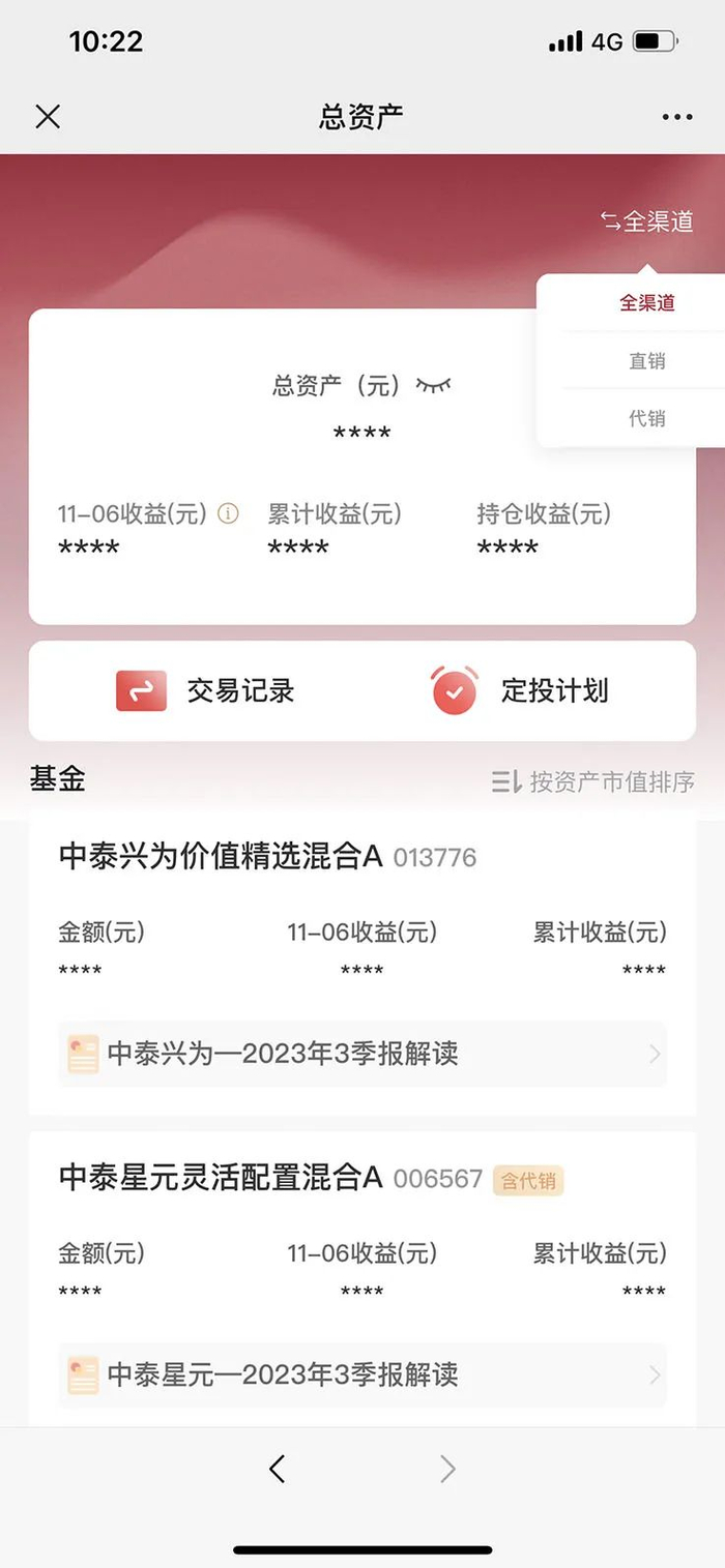 如果您是持有人,点击菜单栏的「账户交易-资产查询」,就能像进入App一样查询最新资产,还可以切换直销/代销/全渠道视角。「账户交易-收益中心」不仅把收益算得明明白白,还能切换本月、今年、全部时间维度。资产、收益都仅需一次登录,后续一触即达。