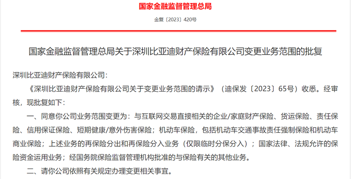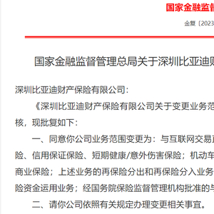 【大河财立方消息】11月8日消息,国家金融监督管理总局日前批复,同意深圳比亚迪财产保险有限公司(下称比亚迪财险)变更业务范围。与此前相比,比亚迪财险的业务范围新增了“机动车保险,包括机动车交通事故责任强制保险和机动车商业保险”。