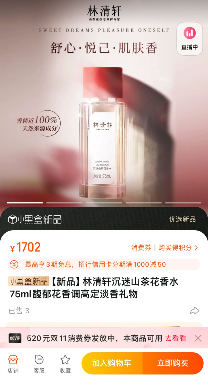 一款名为“沉迷山茶花”的香水最近在林清轩天猫旗舰店上架,只有75毫升一种规格,售价却达到1702元。在产品描述中,这款香水前调、中调和后调分别采用柠檬、苦橙、玫瑰和香草等原料,唯独缺少山茶花。