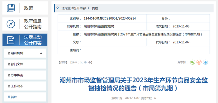 广东省潮州市市场监管局发布2023年生产环节食品安全监督抽检情况(市局第九期)