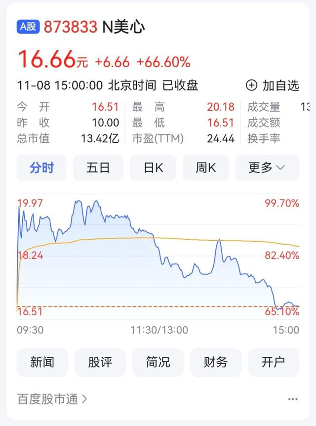 美心翼申开盘价16.51元,也是全天最低价,最高20.18元(涨100.18%),当天最终报收16.66元,较发行价10元大涨66.66%,对应的滚动市盈率24.44,换手率49.65%,总市值13.42亿元。