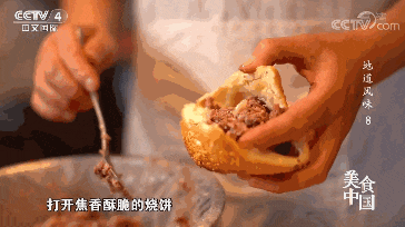 外皮脆香,烧饼内部形成网状般的孔洞,酥软劲道。唯一能与之匹配的就是刚出锅的驴肉。
