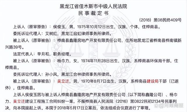 吴立迁为1970年生人,因卷入建设工程施工合同纠纷,多次出现在裁判文书中。2018年8月7日的一份文书显示,吴立迁为桦南县建筑局退休干部,同为被告的杨巾力为桦南县环保局干部。同年12月的一份文书显示,杨巾力是吴立迁的妻子,比他小4岁。