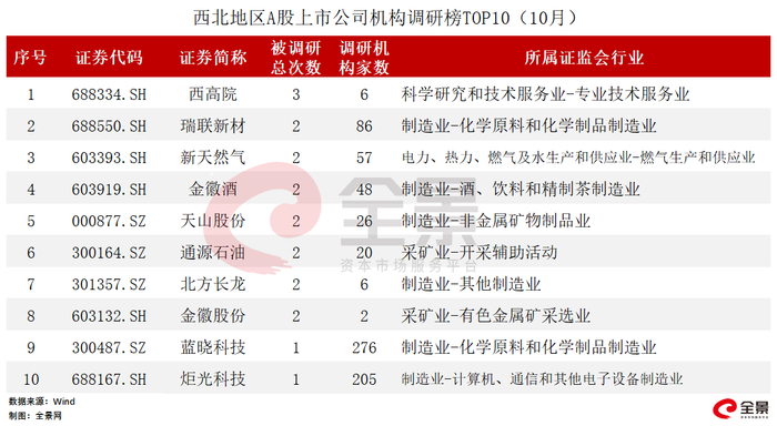 2023年10月,西北地区共有40家A股上市公司接受调研,其中,西高院被调研3次,参与机构6家;机构数量最多的为蓝晓科技,1次共计276家机构参与调研。