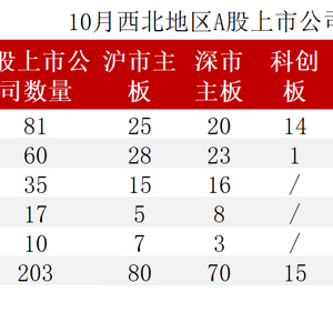全景统计,截至2023年10月31日,西北地区(陕西省、宁夏回族自治区、青海省、甘肃省、新疆维吾尔自治区)共有A股上市公司203家,较上月新增1家,其中上交所主板80家,科创板15家,深交所主板70家,创业板31家,北交所7家。10月,西北地区新增的1家上市公司为创业板公司陕西华达。