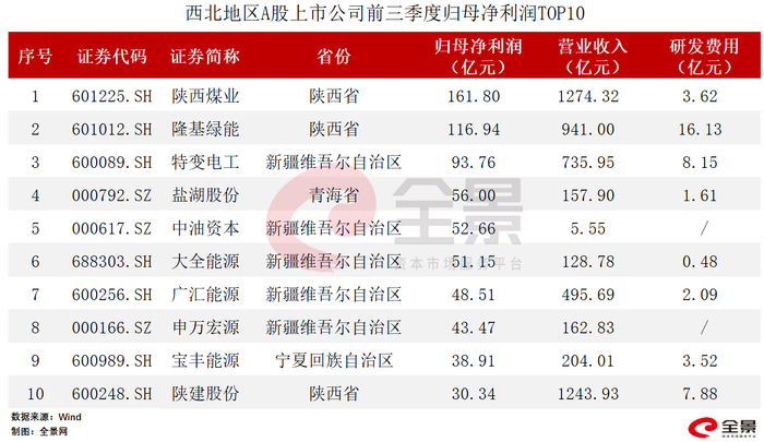 其中,陕西煤业、陕建股份、隆基绿能分别以1274.32亿元、1243.93亿元和941亿元的营业收入位列前三,约占西北上市公司前三季度总营业收入的24.82%;陕西煤业、隆基绿能、特变电工前三季度归母净利润最高,分别为161.8亿元、116.94亿元、93.76亿元,约占西北地区上市公司的35.38%。