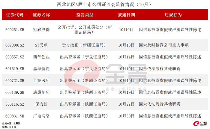 10月,西北地区共有8家A股上市公司收到证监会及地方证监局问询、监管函件,涉及因信息披露虚假或严重误导性陈述、未及时披露公司重大事项等。