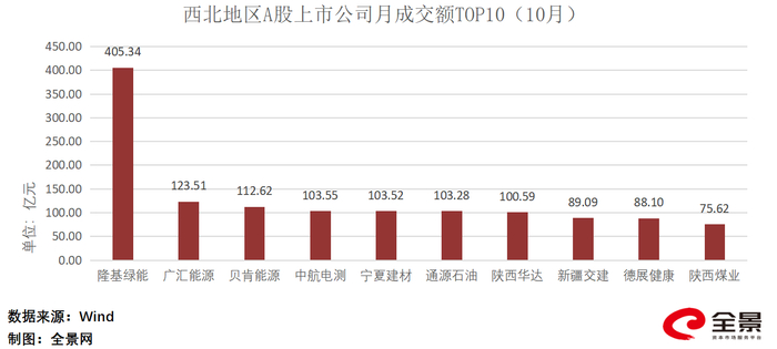 截至2023年10月31日,西北地区A股上市公司的总月成交额为4640.07亿元,排名前三的上市公司分别是隆基绿能、广汇能源、贝肯能源,这三家上市公司月成交额共约占西北五省A股上市公司的总月成交额13.82%。