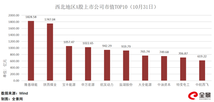截至2023年10月31日,西北地区A股上市公司总市值为27085.99亿元,较上月减少1094.08亿元,约占A股上市公司总市值的3.2%。其中,市值排名第一的公司是隆基绿能,市值为1828.58亿元;陕西煤业排名第二,市值为1747.04亿元;宝丰能源市值为1057.47亿元,排名第三。