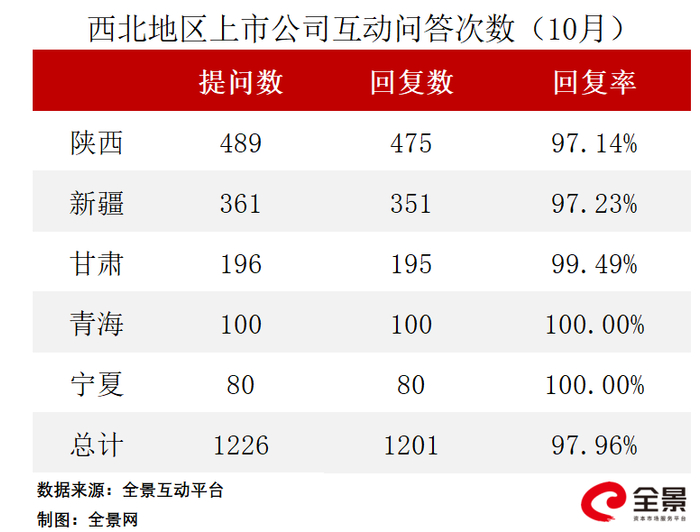 据全景数据统计,2023年10月,西北地区A股上市公司在投资者互动平台共收到提问1226个,回复数量为1201个,回复率为97.96%。其中,互动问答次数排名前三的公司分别为ST大集、陕西华达和敦煌种业。