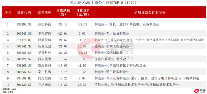 不考虑上市首日涨跌幅,2023年10月,西北地区A股上市公司涨幅排名前10位的公司中,制造业占据7席。其中,*ST天山和卓青龙管业表现亮眼,10月涨幅分别为122.82%和41.92%;莱特光电10月涨幅排名第三,达到17.3%。