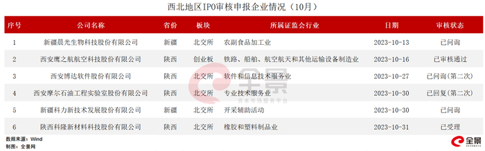 10月,西北地区新增1家IPO受理公司,为拟在北交所上市的陕西科隆新材料科技股份有限公司。新疆天物生态环保股份有限公司辅导备案终止。