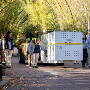 △11月8日上午,工作人员将载有大熊猫“美香”的“旅行包厢”移出华盛顿史密森学会国家动物园。
