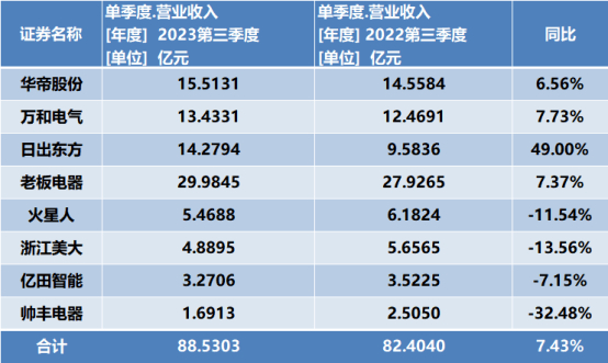 从单季度来看,2023年第三季度厨电行业头部企业出现明显的好转。数据显示,8家厨电上市企业实现总营收88.53亿元,较去年同期的82.40亿元增长7.43%。从2023年第三季度营收增速来看,华帝股份、老板电器、万和电气、日出东方均有所增长。