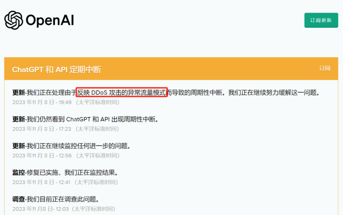 OpenAI公司周四(11月9日)最新回应称,正在努力解决“异常流量”问题,并表明黑客正试图使其服务陷入困境。该公司回应,它发现了ChatGPT受到DDoS(分布式拒绝服务)攻击的迹象。DDoS攻击是外部攻击者试图通过反复发送Ping请求,从而使网络或服务器超载而崩溃。OpenAI表示,“我们正在处理由于反映DDoS攻击的异常流量模式而导致的周期性中断。我们正在继续努力缓解这种情况。”