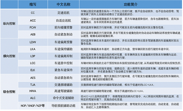 这个表格罗列了一大堆专业术语,简要描述了驾驶辅助及智能驾驶相关的多个单项细分的功能,AEB功能只是其中在整车的纵向控制方面实现自动紧急制动的功能。在许多时候,AEB和FCW、ACC等功能是共同出现的。纵向的ACC+AEB功能与横向控制LKA+LDP+LCC等功能进行合理组合,就可以实现更多综合控制的功能如TJA交通拥堵控制、HWA高速驾驶辅助等。