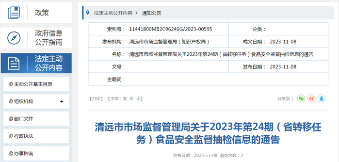 广东省清远市市场监督管理局关于2023年第24期(省转移任务)食品安全监督抽检信息的通告