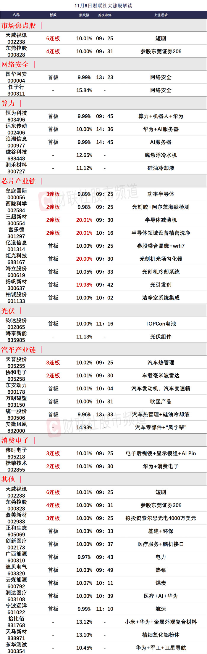 汽车产业链近期分化和局部活跃态势并存,天普股份3连板,协和电子、东安动力、万朗磁塑等涨停。消息面上,乘联会微信号8日发布2023年10月份全国乘用车市场分析。其中提到,10月新能源乘用车市场零售76.7万辆,同比增长37.5%,环比增长2.7%。随着车市的逐步走强,车企期待努力完成年度目标的信心增强,11月车市同比会暴增20%以上。智界S7汽车官宣,11月9号晚将直播发布智慧出行解决方案发布暨智界S7新品预售。而长安、华为、宁德时代联合推出的阿维塔12将于11月10日正式上市。