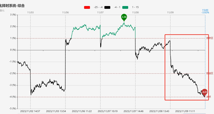 指标显示,短线情绪今早低开于0轴下方后,随着多只龙字辈股的跌停,加上连板股方向多股遭到核按钮下杀,使得盘中跌停家数持续增多。而减肥药率先破位带动多个前期热点板块的悉数退潮,午后短线情绪跌破低迷区后继续加速探底,最终报收于冰点附近。