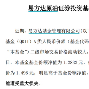 11月8日,易方达基金管理有限公司(下称“易方达基金”)发布公告称,旗下易方达原油证券投资基金(QDII)A类人民币份额(基金代码:161129,下称“原油LOF易方达”)二级市场交易价格波动较大,请投资者密切关注基金份额净值。