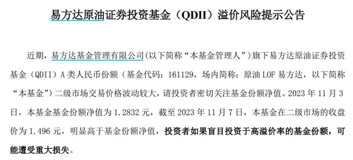 11月8日,易方达基金发布公告称,旗下原油LOF易方达的二级市场交易价格波动较大,请投资者密切关注基金份额净值。2023年11月3日,该基金基金份额净值为1.2832元,截至2023年11月7日,该基金在二级市场的收盘价为1.496元,明显高于基金份额净值。