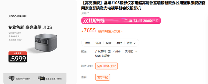 在拥有162万粉丝的天猫 “JMGO坚果投影旗舰店”中,《消费者报道》发现这款投影仪正准备参加“双11抢先购”,6期免息的价格为5999元。