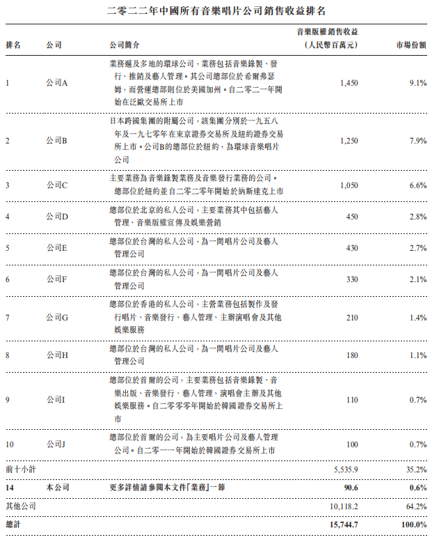 按2022年中国授出音乐版权及录制产生的收益计,风华秋实在400多间音乐唱片公司中排名第14位,市场份额约为0.6%。在总部位于中国的200多间音乐唱片公司中,公司排名第3位,市场份额约为1.5%。