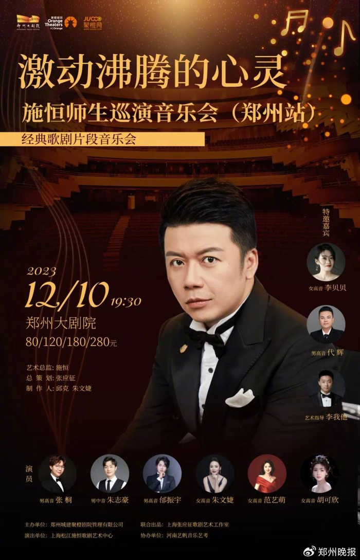 入选2013CCTV“光荣绽放-中国十大男中低音歌唱家音乐会”的著名旅法男中音歌唱家施恒,将携上海音乐学院声乐歌剧系优秀学子,在郑州大剧院音乐厅举办《激动沸腾的心灵》经典歌剧片段音乐会,带来一场高雅华丽和内涵厚重的视听盛宴!