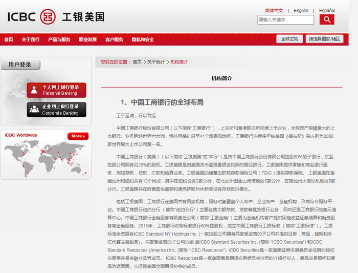 公开资料显示,中国工商银行(美国)(以下简称“工银美国”)是由中国工商银行股份有限公司控股80%的子银行,东亚控股公司拥有另20%的股权。工银美国是由美国货币监理署颁发执照的国民银行。工银美国提供零售和商业银行服务,例如存款,贷款,汇款和结算业务。工银美国的储蓄由联邦存款保险公司(FDIC)提供存款保险。 工银美国在美国加州和纽约共有13个网点,其中在纽约设有3家分行,在北加州旧金山海湾地区5家分行,在南加州大洛杉矶地区5家分行。工银美国并在西雅图华盛顿和德克萨斯州休斯顿设有存贷款办事处。