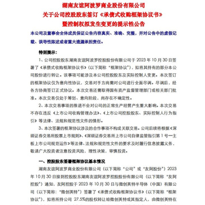 湖南友谊阿波罗商业股份有限公司发布关于公司控股股东签订《承债式收购框架协议书》暨控制权拟发生变更的提示性公告。