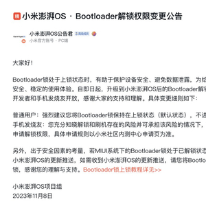 就在今天,小米官方发布了关于小米澎湃OS Bootloader 解锁权限的公告,划重点:开发者和手机发烧友依然可以申请解锁。