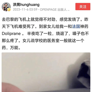 近日,知名出版人洪晃在社交媒体上的一则发文,意外引起了网友热议。洪晃在文中表示,她在飞往巴黎的途中感到发烧不适,女儿送她一盒“法国神药”,她半夜吃了一粒“烧退了,嗓子也没那么难受了”。