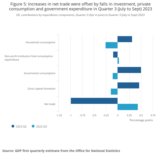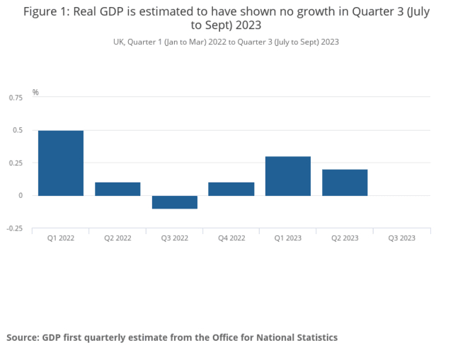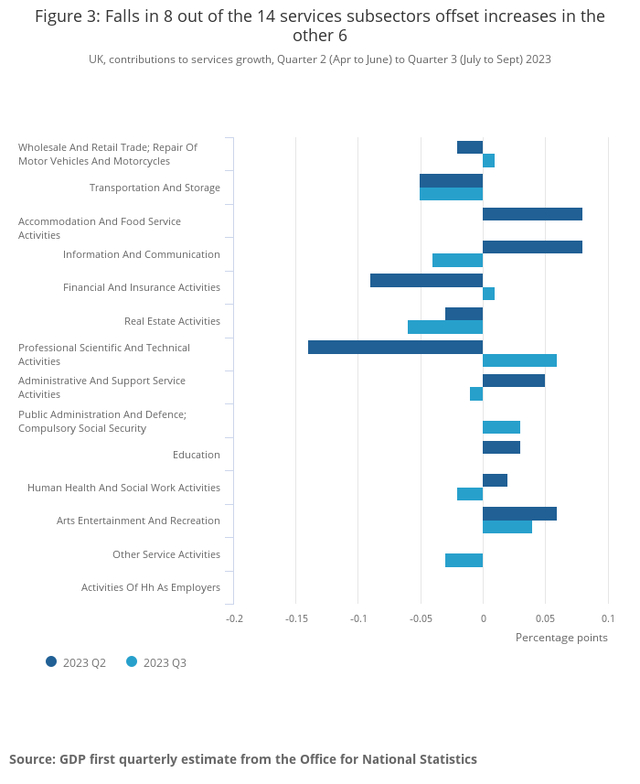 高利率影响显现:英国三季度GDP环比增速为0,家庭消费与政府支出萎缩,服务业产出下降。