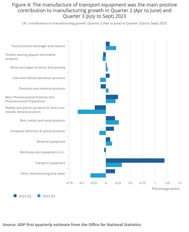 就产出而言,英国三季度服务业产出下降了0.1%,抵消了建筑业产出增长的0.1%,生产制造部门产出持平。