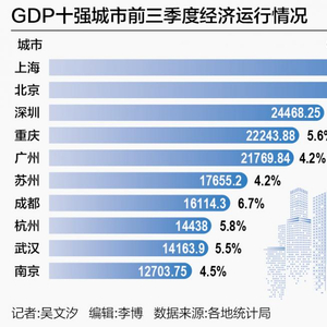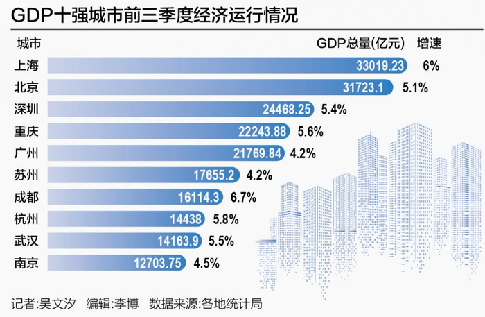 上海、北京、深圳、重庆、广州、苏州、成都、杭州、武汉、南京,全国GDP十强城市的前三季度经济数据均已公布。