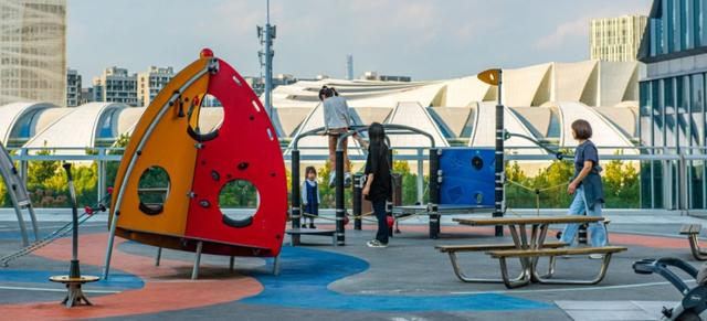 三楼连廊,则完全是一个开放式的大空间,其中面向东方体育中心的户外儿童乐园堪称孩子们的快乐天堂。在这里,攀爬架、旋转盘、秋千、滑梯一应俱全。