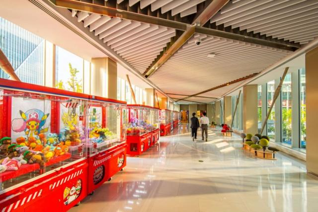 连廊内部,一头通往奈尔宝前滩店,另一头连接kidsland,沿路一排娃娃机,以及几组萌态十足的座椅,到了某些特定时段,连廊还会变身小型展览空间,给路过的你一个惊喜。