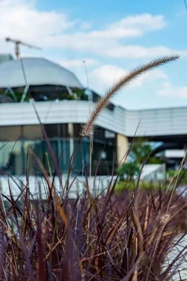 连廊上排列着多个花艺景观设计,一株株的花草在秋风下摇曳生姿。