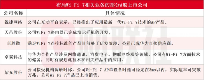 据不完全统计,布局Wi-Fi 7相关业务的A股上市公司主要有锐捷网络、天邑股份、卓胜微、卓翼科技和紫光股份等,具体情况如下: