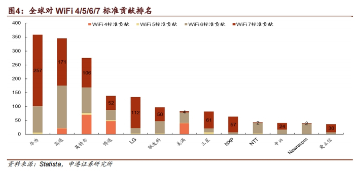 华为成为全球WiFi标准贡献领跑者。根据Statista数据显示,截至2021年,华为对WiFi 7标准贡献达到257个,全球领先;美国公司高通和韩国LG分列二三名,分别为171和112个。华为同时也是全球对WiFi 4,WiFi 5,WiFi 6,WiFi 7标准贡献总和最高的公司,高达359个。