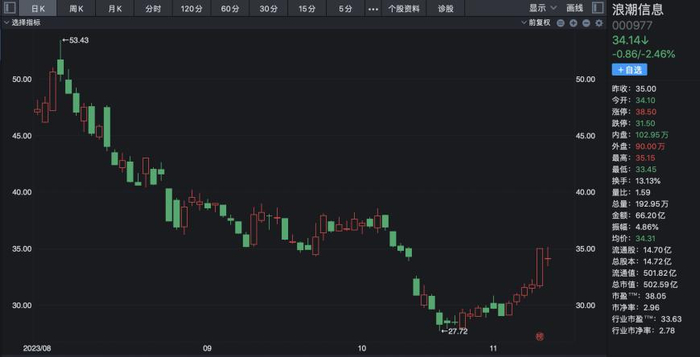 据科创板日报周四独家消息,英伟达或将推出针对中国区的最新改良版AI芯片,消息刺激下浪潮信息尾盘拉升逼近涨停,成交额近55亿元。而在此前10月17日美国更新针对AI芯片出口管制升级后,公司股价次日封死跌停板,单日市值蒸发超50亿。拉长时间看,浪潮信息股价乘上AI浪潮在6月创历史新高后便一路下跌,迄今累计最大跌幅已腰斩。