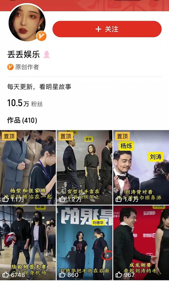 例如,@丢丢娱乐 目前已经有10.5万粉丝,内容主要是明星八卦内容,比如“注意看,宫哲将手放在后面的铁架上,张一山把手推开”、“注意看,陆毅鲍蕾夫妻二人现身机场”,这些内容都是上万的点赞。粉丝达到27.9万的博主@含笑半步癫 则主要发布一些“游泳遇见老虎”、“神奇化妆术,这也太吓人了”等内容。即便是个人原创账号,也会有一些相对下沉的内容。