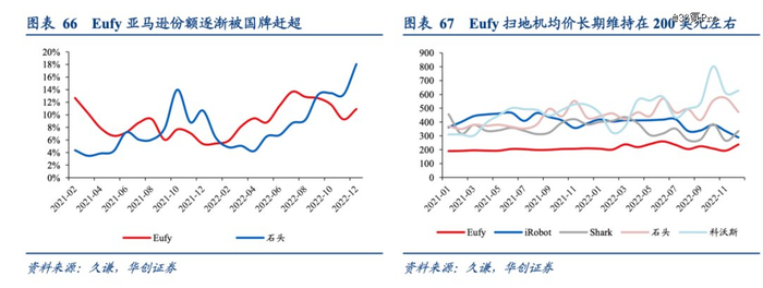 以安克创新智能扫地机业务为例,其智能扫地机品牌Eufy好评率高于海外龙头,早期份额仅次iRobot。时至今日美国消费者仍对Eufy扫地机在吸力/清洁力功能的好评率达到 63.8%/81.6%,高于龙头iRobot与Shark 品牌。该业务前期借助安克渠道、品牌等优势,北美市场份额一度达到 22.6%,远高于国内龙头科沃斯石头科技