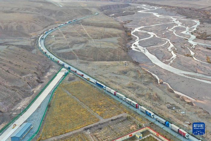 入境车辆有序进入新疆伊尔克什坦口岸(11月7日摄,无人机照片)。