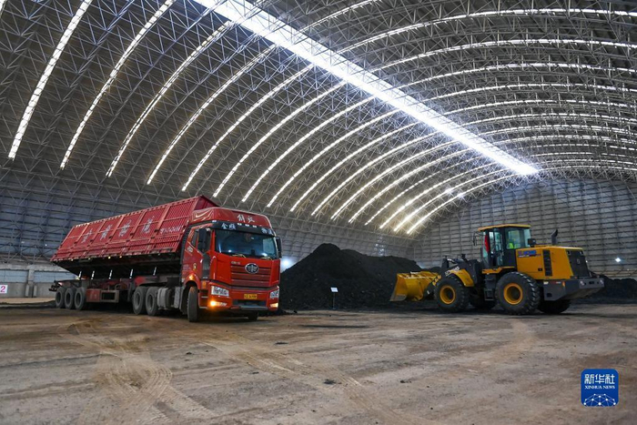 在位于新疆伊尔克什坦口岸的储配煤保税库,车辆卸载来自吉尔吉斯斯坦的进口煤炭(11月7日摄)。